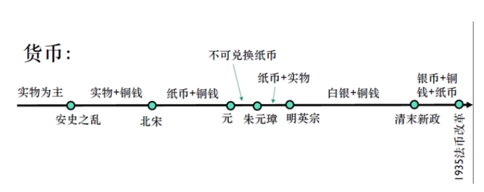 中国传统社会的交易媒介,唐之前以实物为主,唐之后开始逐渐的有铜钱,中国一直是比较缺乏贵金属、食物、铜钱;宋后期纸币出现,纸币+铜钱;明朝后有一个很重要的变化,就是美洲的白银开始输入中国,然后就有比较多的白银和铜钱同时作为货币;到清末我们有大量的银币,最终有法币改革。
