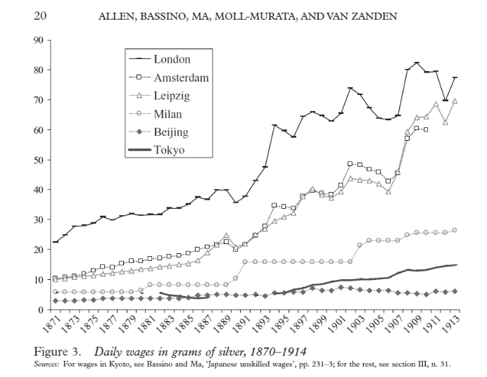 著名经济学家Robert Allen做了一系列关于工资问题的研究。18世纪时,中国的实际工资与日本及欧洲其他地方(中部地区和南部地区)相近,而落后于欧洲的领先地区(英国和少数低地国家)。后来,日本和欧洲部分地区工资都升高了,但中国长期处于低水平。考察工资与能源价格这一比例,欧洲的特点是工资贵、能源便宜,而中国长期是工资便宜,能源贵。
