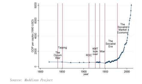 具体看中国收入水平的变化。在鸦片战争以前,经济相对而言是停滞的,近代还稍微落后一点。二战时期,中国的人均收入水平进一步下滑。新中国建立以后,我们经历了一些波折,但总体上是上升的。快速上升是改革开放之后,出现直线的拉升。这就是中国长时段收入水平的变化。