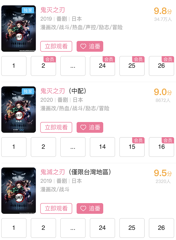 在B站,虽然评分超高,但是《鬼灭之刃》的播放数据并不出色,三个版本的动漫,总计评分数量还不足36万,播放量不足6亿次。而腾讯动漫评分8.8的《斗罗大陆》播放量已经超过了230亿次,两者的数据表现悬殊。相比较在日本的横扫无敌,在B站的运营下,《鬼灭之刃》在国内被各种动漫按在地上摩擦。