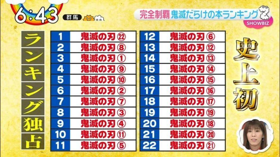 But,But,But,2019年一部黑马《鬼灭之刃》杀出,以190完本险些登顶。2020年上半年的日本漫画销量排行榜,《鬼灭之刃》竟然将刚刚进入顶上战争后剧情最高潮戏份的《海贼王》拉下了销量王座。同时,《鬼灭之刃》还成了史上首部独占漫画销量周榜第1~22位的作品。