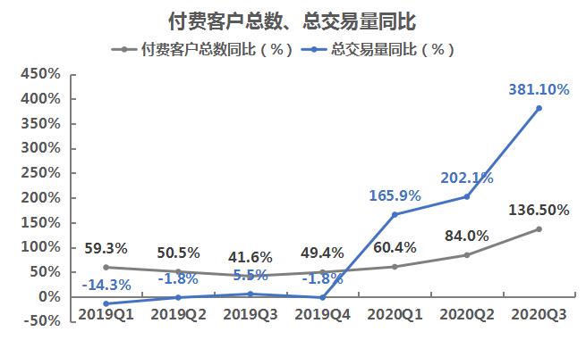 2020年三季度,富途的付费客户总数为41.81万,同比增长136.5%,增速加快,客户总交易量为10147亿港元,同比爆涨381.1%,客户总交易量增速约为付费客户增速的3倍,这表明富途的付费客户交投意愿非常强烈,这大概率得益于三季度美股市场的持续走强以及多数明星公司于港美股IPO上市对投资者带来的交易刺激。