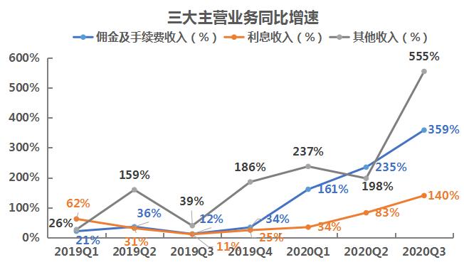交易量破万亿,使得富途的佣金及手续费收入(证券经纪业务)得以快速增长。2020年三季度,富途的佣金及手续费收入为5.63亿港元,同比爆增359%,这已是富途连续三个季度实现收入的三位数同比增长,跟总交易量381.1%的同比增速保持一致。