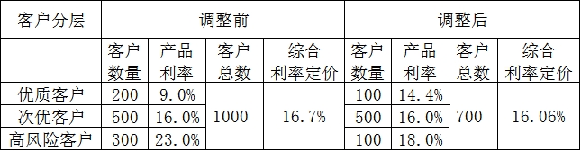 假设该机构有1000名客户,授信额度统一,其中200人是优质客户,适用的产品利率是9%;500人是次优客户,适用的产品利率是16%;剩下的300人是高风险客户,适用的产品利率是23%。那么该机构调整前的平均产品利率就是: