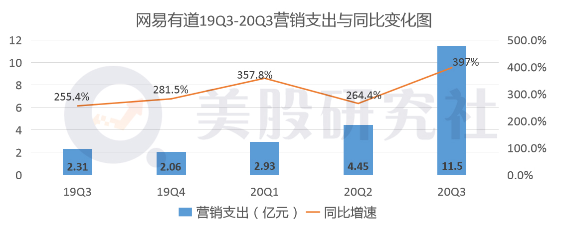 而这个“代价”的最大组成部分为本季度营销费用的增长。据财报数据显示,有道三季度总营业费用为13.06亿元,相较于上年同期的3.24亿元相比,同比上涨303.1%;与二季度的5.65亿元相比,环比上涨131.2%。