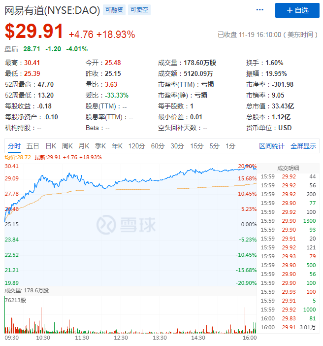 美东时间11月19日美股盘前,有道发布了2020财年第三季度的财务报告。财报发布后,有道盘前一度大涨超18%。截至美股研究社发稿,有道每股报28.71美元,总市值为33.43%。