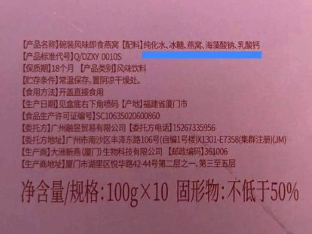 配料表是能看出许多猫腻的,辛巴团队带货的这款燕窝,配料表上明确标明其配料为纯化水、冰糖、燕窝、海藻酸钠和乳酸钙。