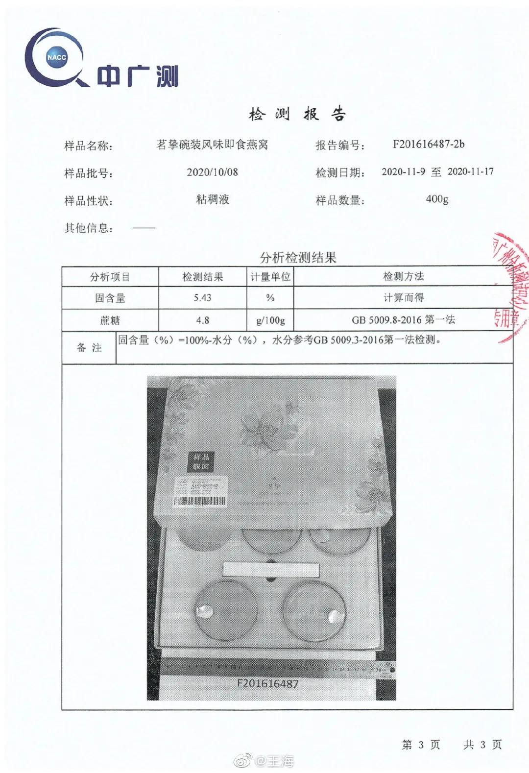 争议产品是一款品牌名为「茗挚」的燕窝,职业打假人王海提供的检测报告显示,该产品蔗糖含量为4.8%,碳水化合物为5%,证明该产品就是糖水。
