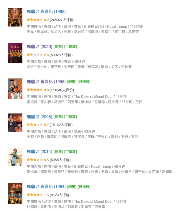 新《鹿鼎记》上线一天后,直接带火了观众对老版《鹿鼎记》的热情,豆瓣热门电视榜单20个剧目列表中出现了从1984年到2020年5个版本的《鹿鼎记》。