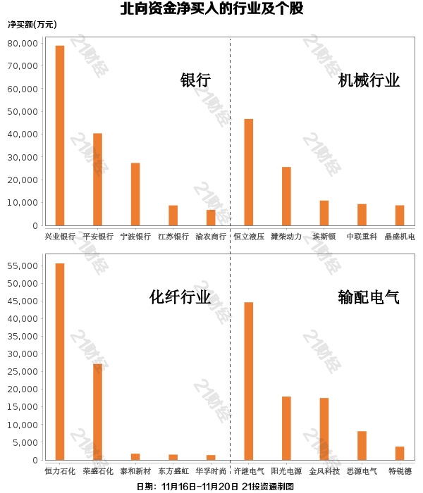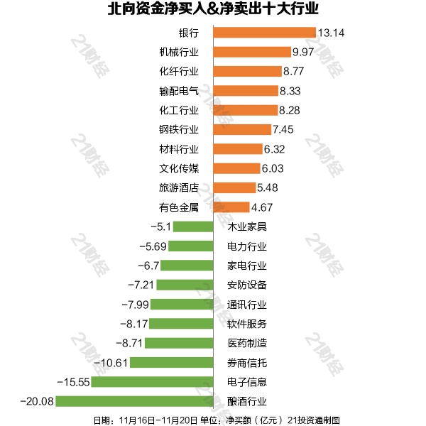 行业方面,本周北向资金增持了33个行业,其中银行居首,净买入金额达13.14亿元;其次是机械行业行业,净买入9.97亿元。