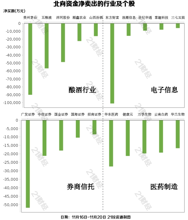 酿酒行业继上周被大幅净卖出18亿后,本周再度被净卖出合计约20亿元。但白酒板块内部出现分化,老白干酒(600559.SH)、古井贡酒(000596.SZ)、迎驾贡酒(603198.SH)、口子窖(603589.SH)等获净买入。而高端、次高端白酒龙头贵州茅台(600519.SH)、五粮液(000858.SZ)、洋河股份(002304.SZ)本周继续遭到北向资金的减持,分别净卖出9.01亿元、5.68亿元、4.88亿元。顺鑫农业(000860.SZ)、山西汾酒(600809.SH)也被净卖出超亿元。