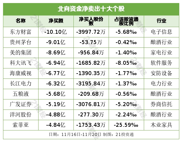 净卖出方面,本周北向资金净卖出东方财富(300059.SZ)、贵州茅台(600519.SH)、美的集团(000333.SZ)、科大讯飞(002230.SZ)、海康威视(002415.SZ)居前,其中,东方财富被净卖出10.10亿元,贵州茅台被净卖出9.01亿元,美的集团被净卖出8.69亿元,科大讯飞被净卖出6.94亿元,海康威视被净卖出6.77亿元。