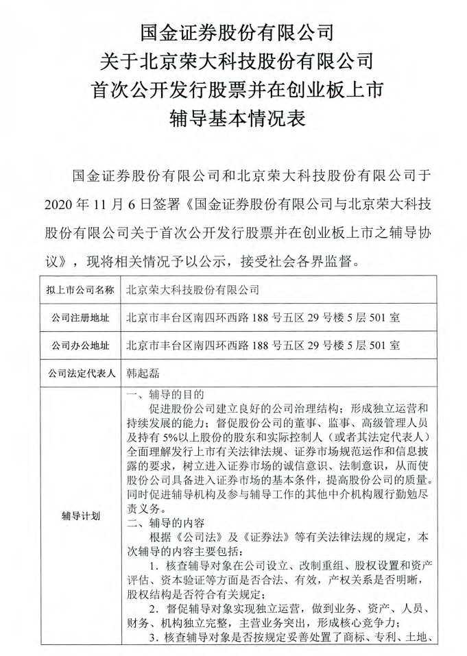 证监会官网显示,北京荣大科技股份有限公司(以下简称“荣大科技”)已于11月6日与国金证券签署《关于首次公开发行股票并在创业板上市之辅导协议》。