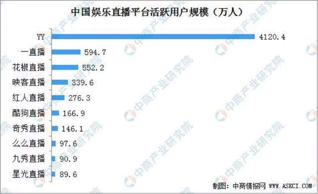 据Mob研究院报告显示,截至2020年第三季度,YY直播移动月活跃用户达4130万,在泛娱乐视频直播行业持续保持领先。2020年3月我国泛娱乐直播行业移动用户规模超过1.5亿人。在竞争格局上,YY直播以市场占有率40%的绝对优势高居行业第一。