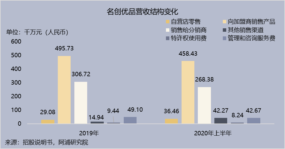 2020年上半年自营店零售收入3.65亿人民币,占比4.26%,向加盟商销售产品收入45.84亿人民币,占比53.53%,销售给分销商收入26.84亿人民币,占比31.34%,其他销售渠道收入4.23亿人民币,占比4.93%,特许权使用费0.82亿人民币,占比0.96%,管理和咨询服务费4.27亿人民币,占比4.98% 。
