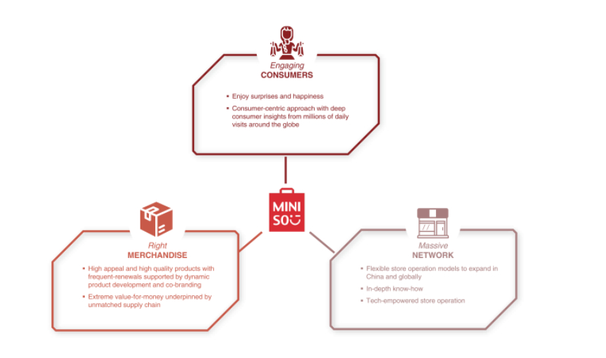 名创优品将价值理念与吸引力,创造力和创新相结合,着眼于长期可持续性而非短期利润。名创优品高效零售方法,主要包括动态产品开发,联合品牌合作和有效的供应链。