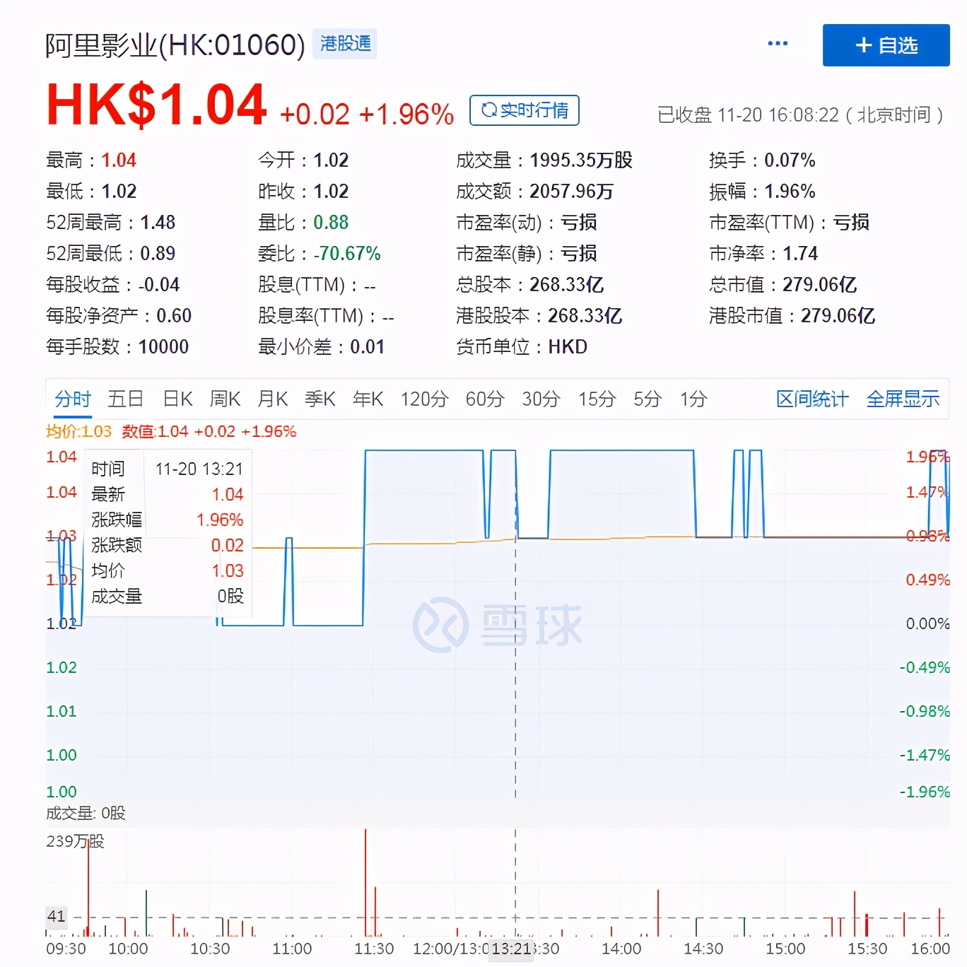 在这样的背景下,作为影视公司佼佼者之一的阿里影业股价在最近的六个月内,有五个月都录得了一定的涨幅。北京时间11月19日晚间,阿里影业公布了截至9月30日止六个月的中期报告数据。财报公布翌日,阿里影业股价累涨1.96%,报收1.04港元,总市值为279.06亿港元。可见,对于这份答卷,资本市场似乎比较满意。