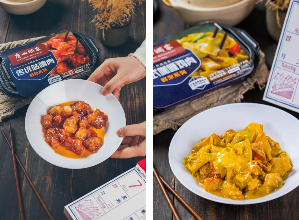 一种是半成品净菜,根据菜式搭配好原材料食材,消费者在家通过简单烹饪即可还原粤菜味道。另一种是半成品,由粤菜师傅大师工作室的粤菜师傅完成酒楼招牌菜最复杂的食材处理、风味调和、翻炒成型等前端环节后,采用食品工艺的活性冻态锁鲜技术保证菜品菜系品质的安全与稳定,最大限度锁住菜品鲜味,消费者通过食品加热即可享用。