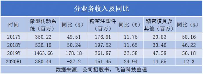 微型传动系统主要应用于移动通信、汽车电子、智能家居与机器人、医疗与个人护理等领域。报告期内,公司微型传动系统销售收入和占比都呈逐年增长趋势,2019年同比增速较2018年大幅增长至178.18%,是公司营收增长的主要来源。公司解释为随着自动化、智能化技术的发展应用,下游应用领域市场大幅增长,客户需求不断增加,带动了公司产品产销量的大幅增长;以及公司产品获得了部分新增用户特别是智能手机领域的主要客户的认可。