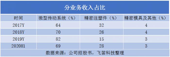 报告期内,公司的主营业务收入占比在99%以上,公司主业明显。其中,主营业务收入由微型传动系统、精密注塑件和精密模具及其他构成。微型传动系统收入占营业收入的比例分别为64%、70%、82%和69%,是主营业务收入最重要的构成部分;精密注塑件销售收入占营业收入的比例分别为32%、26%、15%和28%;精密模具及其他的占比较小,分别为4%、4%、3%和3%。各业务的收入情况如何?