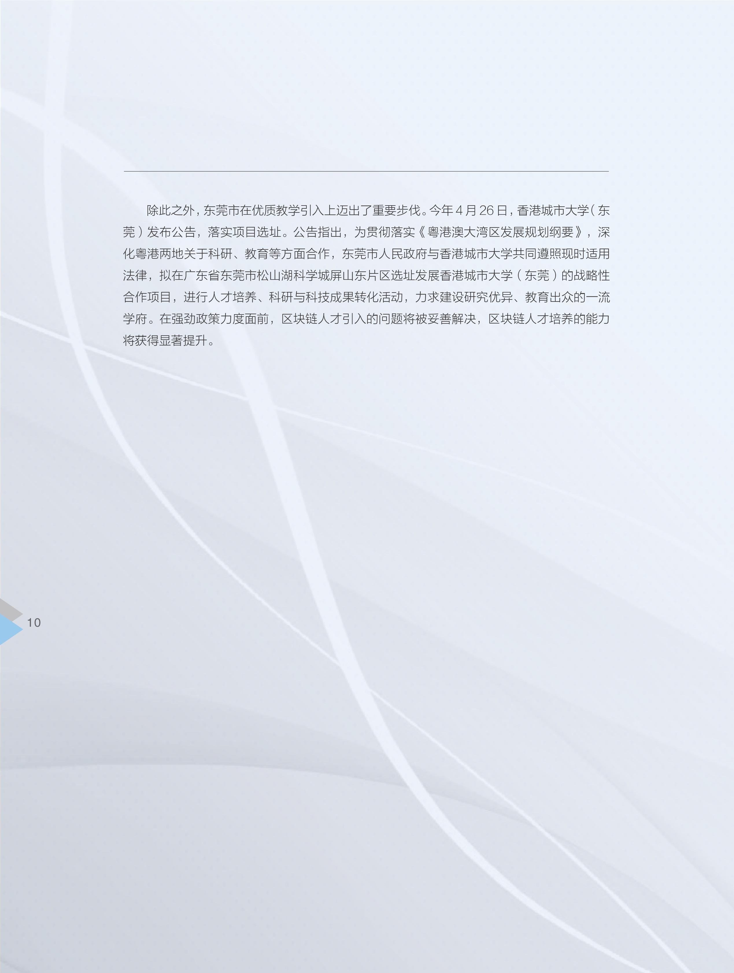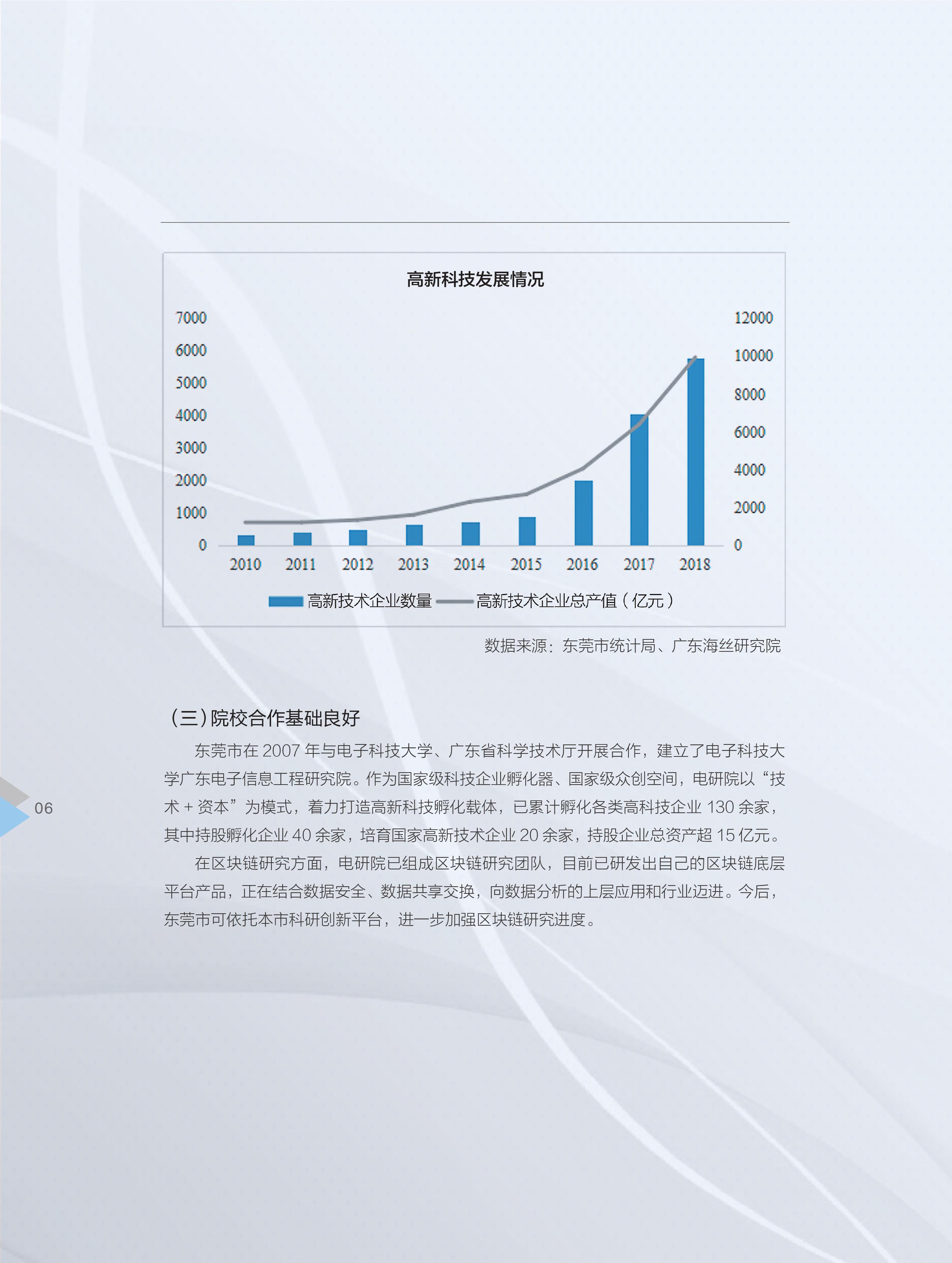 报告认为,东莞市区块链产业发展环境优越。技术层面,作为东莞市国家级科技企业孵化器,电力科技大学广东信息工程研究院成立了专门的区块链研究团队,并已研发出区块链底层平台产品,为东莞区块链发展搭建了技术框架。