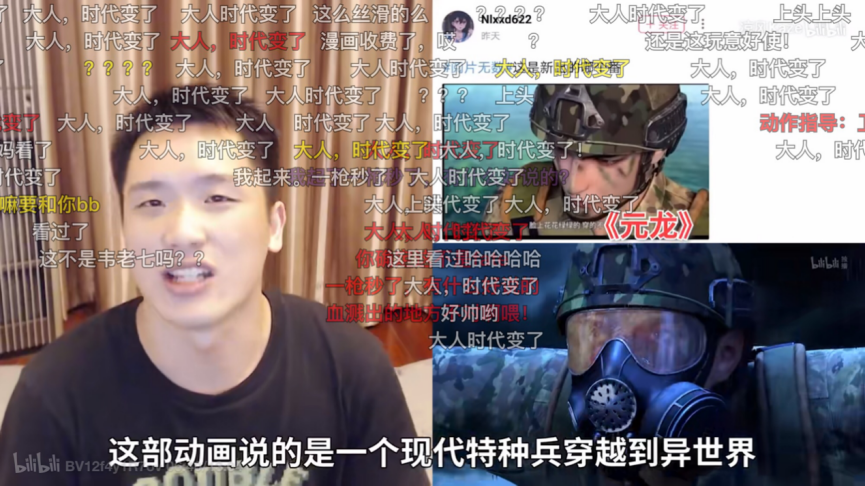 今年7月《元龙》上线B站之初,便因“特种兵穿越玄幻异世界,用手枪直接干掉了反派”这段开场引出了热度,在B站独有的弹幕文化下,一排排的弹幕打出了——“大人,时代变了”的经典老梗。