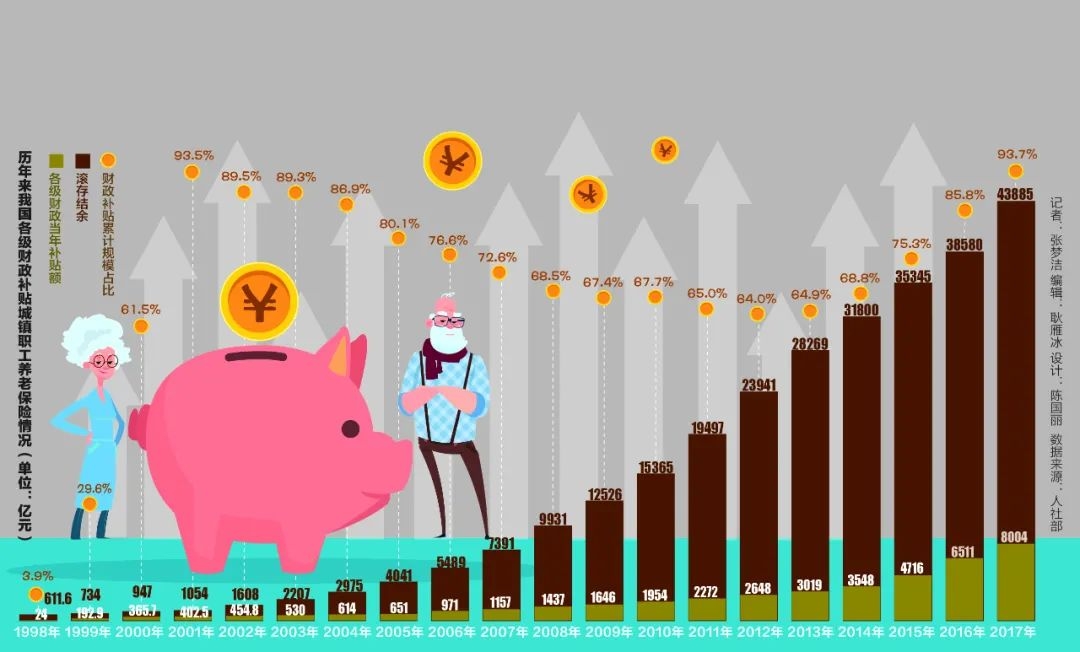 据21世纪经济报道此前梳理,1998-2017年,各级财政对城镇职工养老保险基金的补贴总额达4.11万亿元,几乎与同期城镇职工基本养老保险制度4.39万亿元的滚存结余相当,相当于超九成养老金结余来自财政补贴。