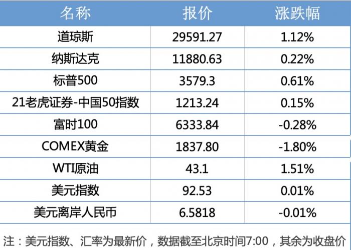 美股三大指数集体收涨,道指涨1.12%,标普500指数涨0.56%,纳指涨0.22%。