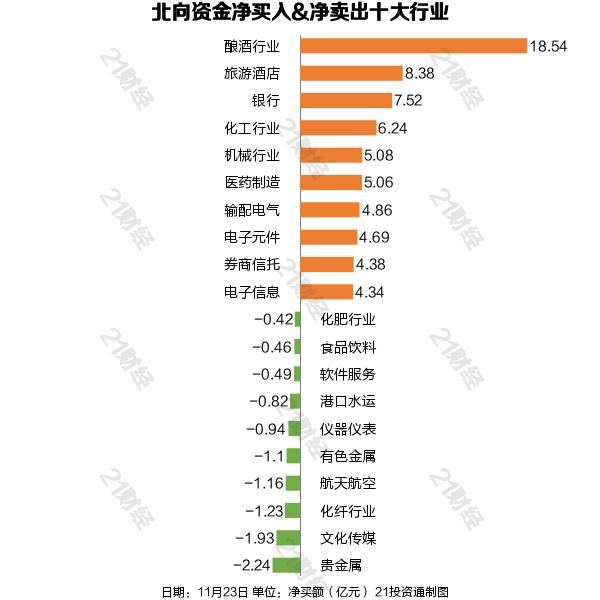 从净买入金额来看,北向资金增持了47个行业,其中酿酒行业居首,净买入金额达18.54亿元其次是旅游酒店行业,净买入8.38亿元。