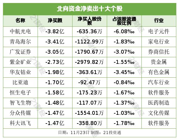 北向资金减持了14个行业,其中贵金属最多,净卖出金额达2.24亿元,其次是文化传媒行业,净卖出1.93亿元。