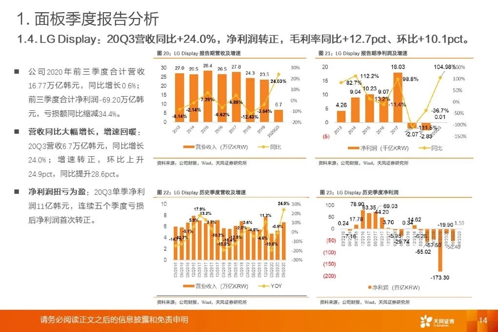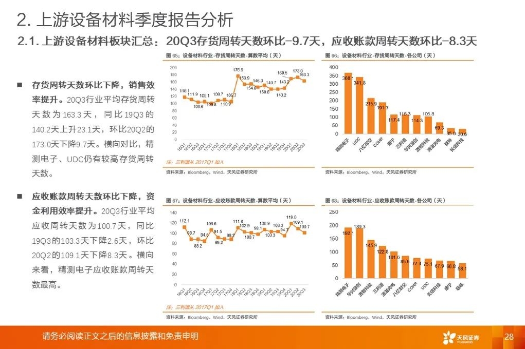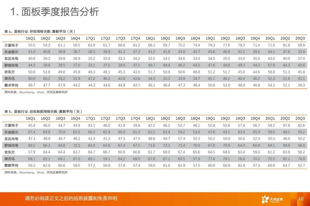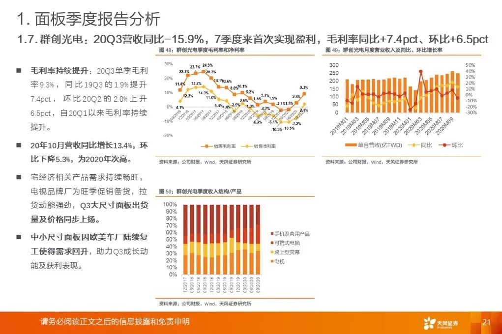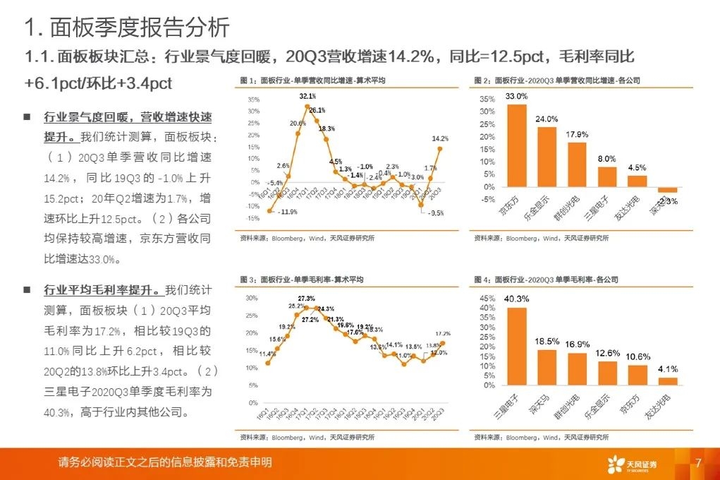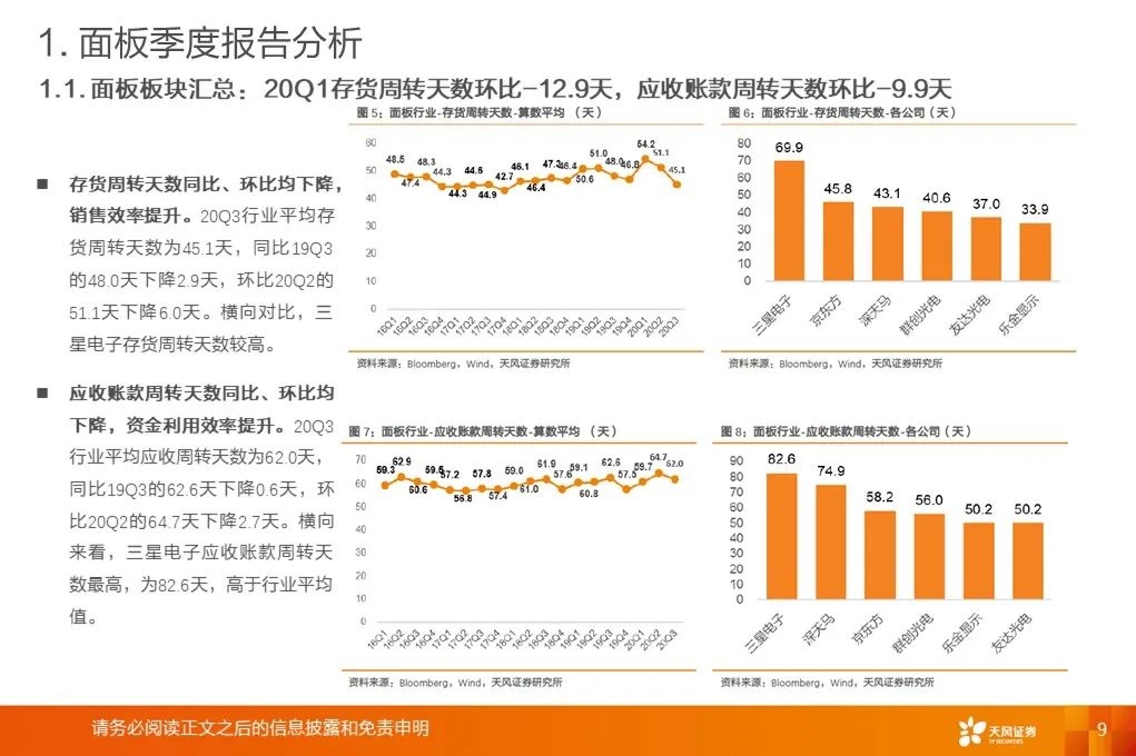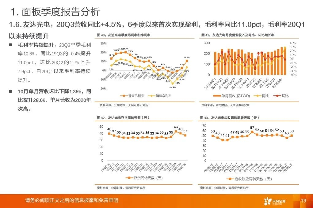 面板行业Q3确认利润拐点:20Q3单季营收同比增速+14.2%,同比+15.2pct/环比+12.5pct。20Q3平均毛利率17.2%,同比+6.1pct/环比+3.4pct。存货周转天数、应收账款周转天数同比、环比下降。LCD面板价格涨势强劲:Witsview数据,2020年11月上半月,32/43/55吋面板最新价格为58/103/160美元,与2020年5月、2019年12月底部相比已上涨81.3%/53.7%/58.4%。