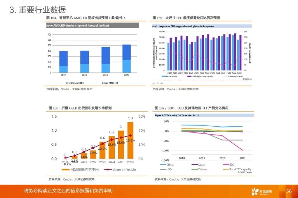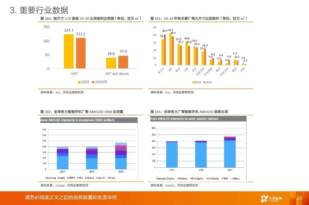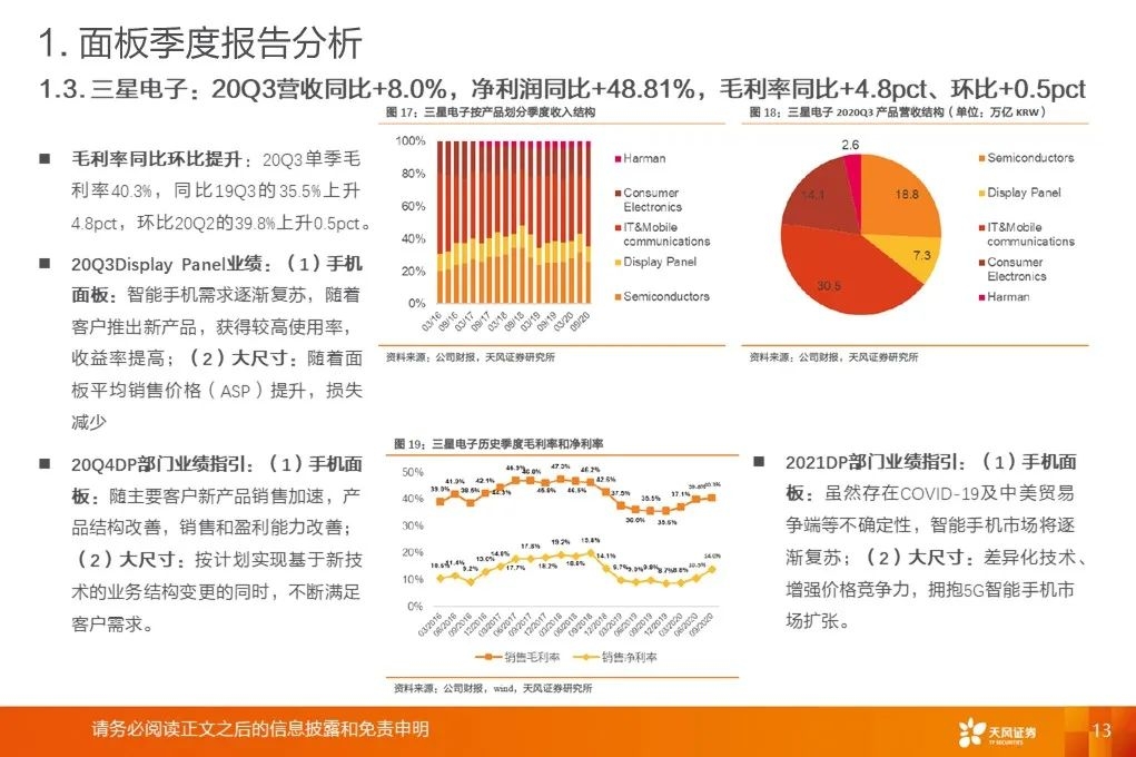 重要指引:三星电子20Q4DP部门业绩指引:a.手机面板随主要客户新产品销售加速,产品结构改善,销售和盈利能力改善。三星电子2021DP部门业绩指引:a.手机面板虽然存在COVID-19及中美贸易争端等不确定性,智能手机市场将逐渐复苏;b.大尺寸差异化技术、增强价格竞争力,拥抱5G智能手机市场扩张。