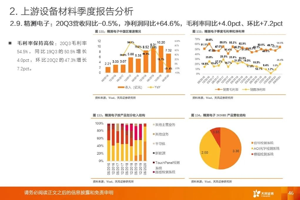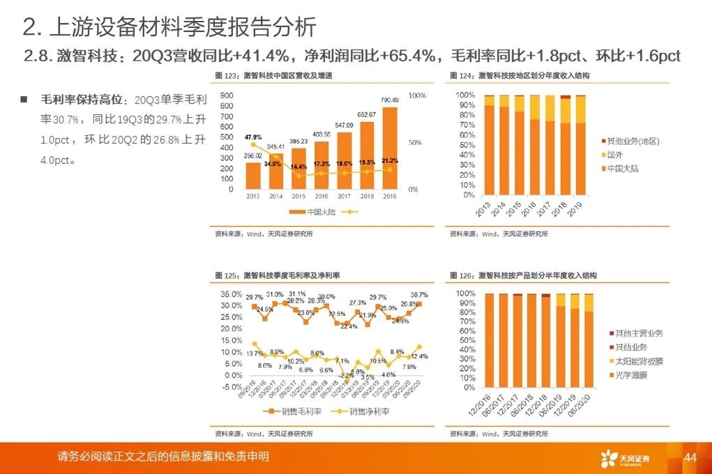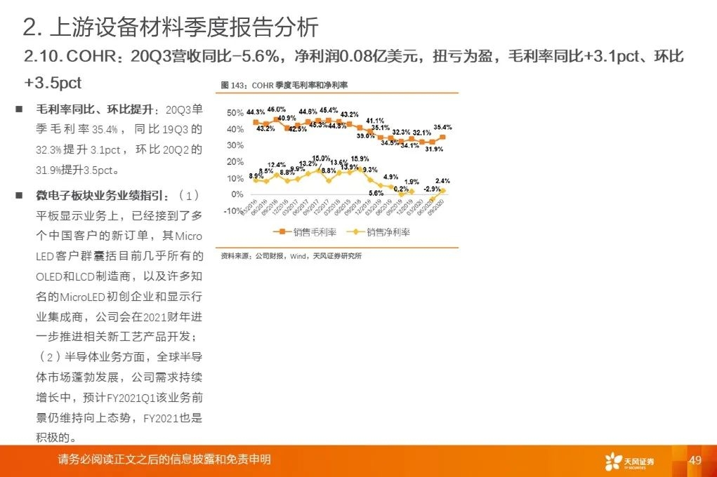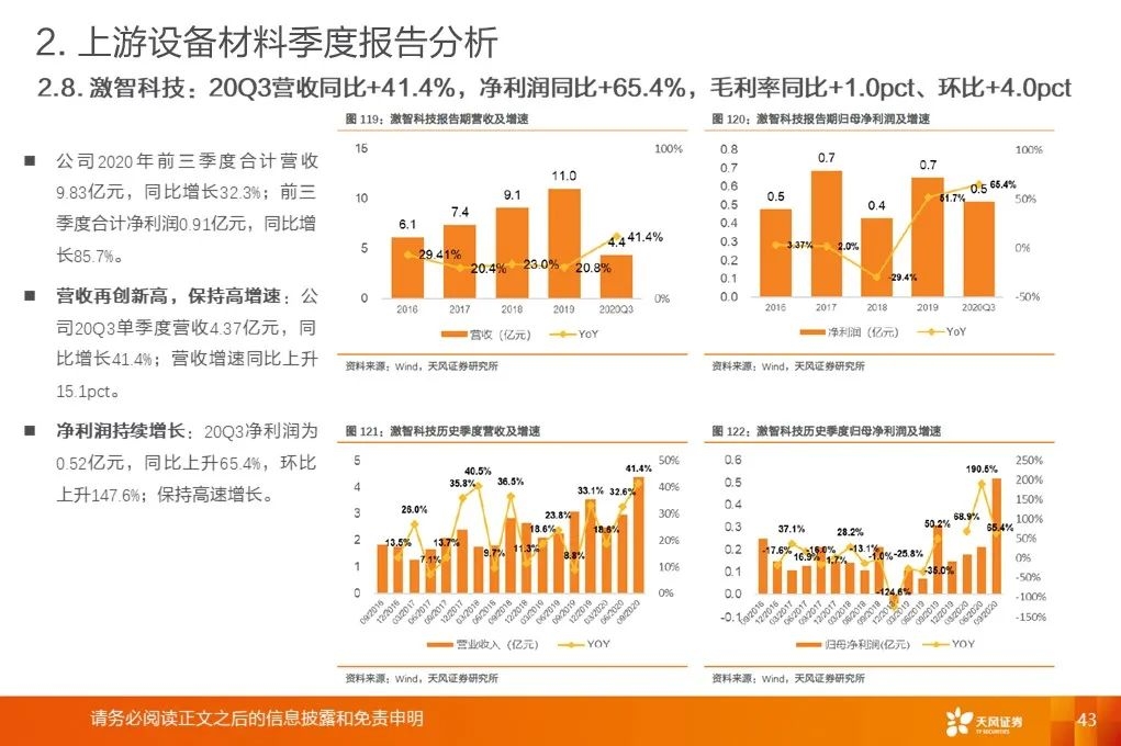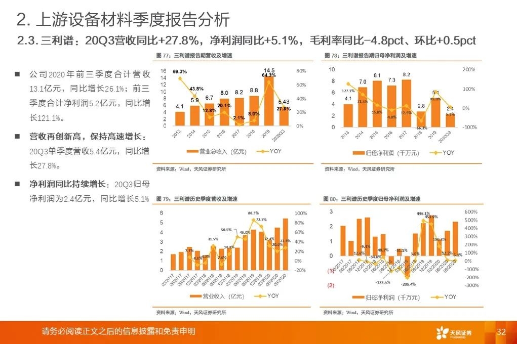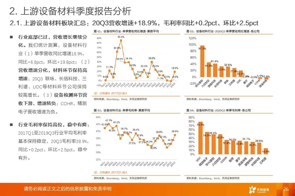 上游行业整体营收增速底部回升:2020Q3平均增速+18.9%,环比提升19.8pct,底部已过,开启增长周期。营收增速继续分化,材料环节保持高增速。行业毛利率稳中有升。2017Q1至2020Q3行业平均毛利率基本保持稳定。