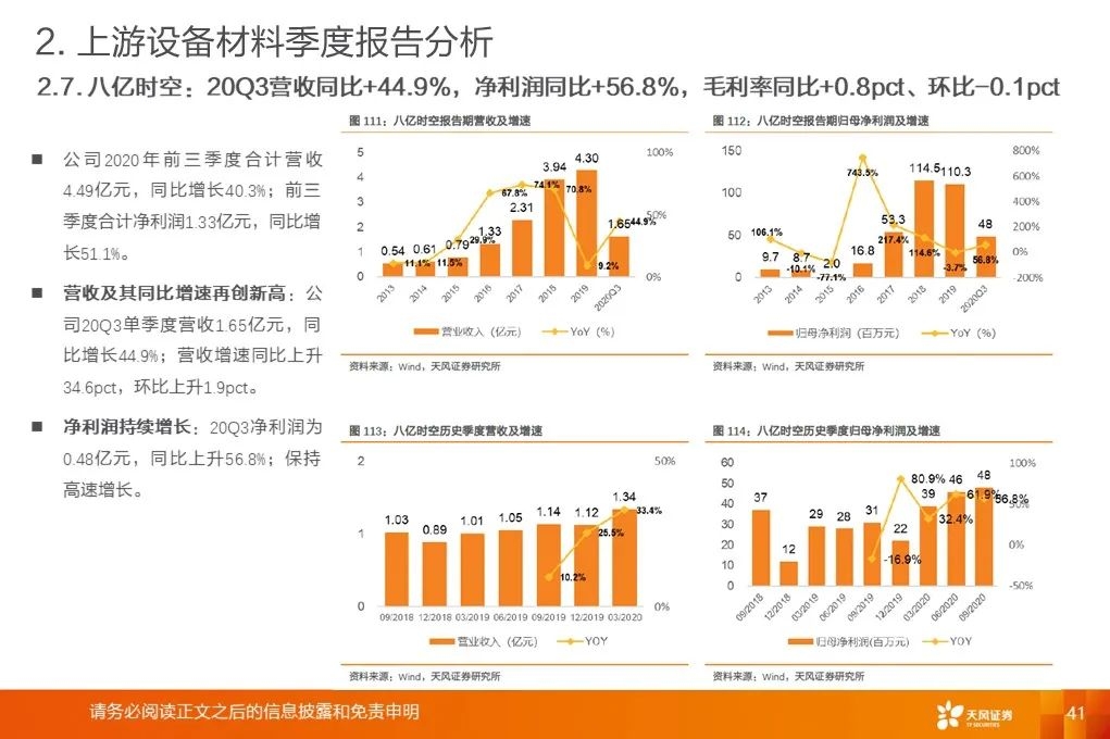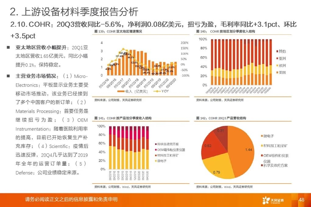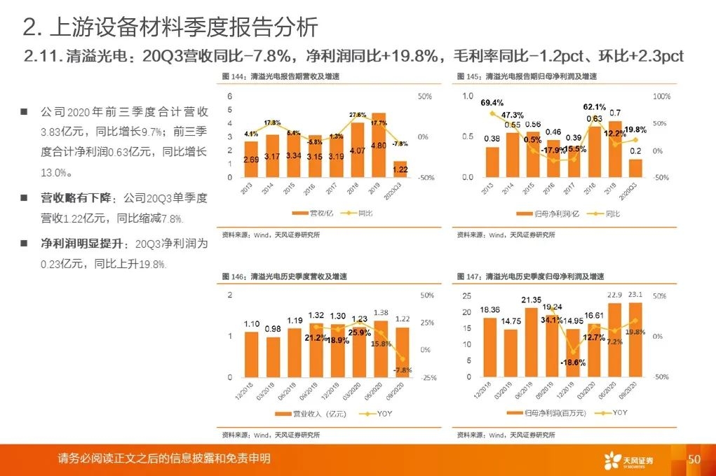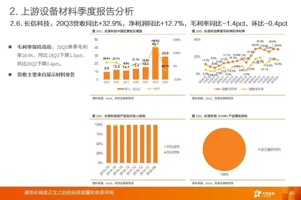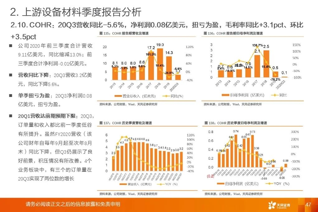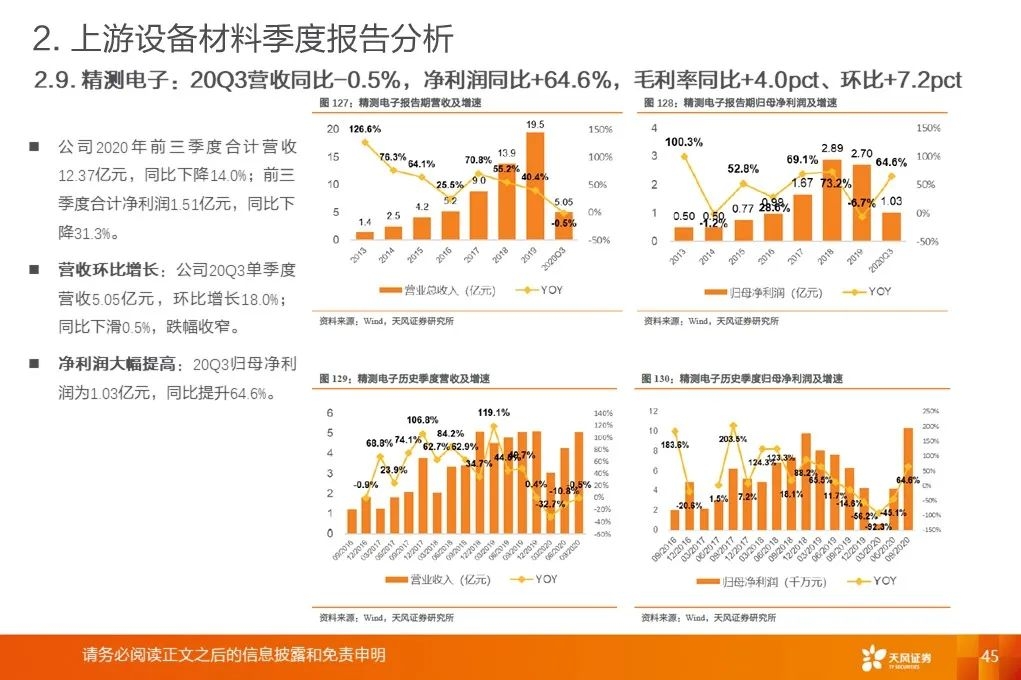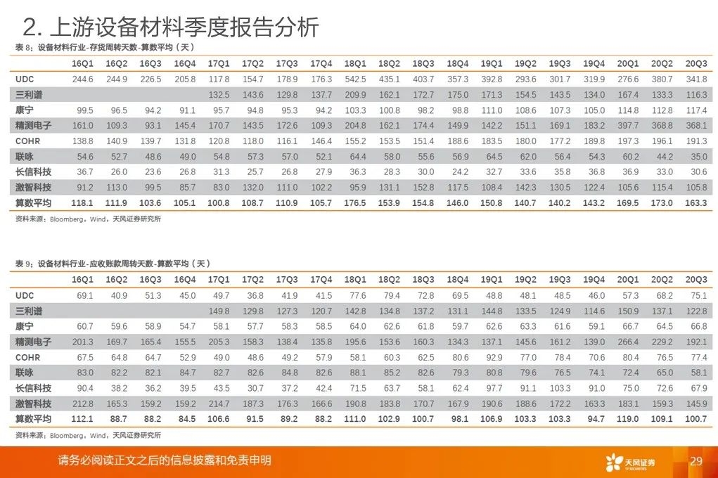 上游行业整体营收增速底部回升:2020Q3平均增速+18.9%,环比提升19.8pct,底部已过,开启增长周期。营收增速继续分化,材料环节保持高增速。行业毛利率稳中有升。2017Q1至2020Q3行业平均毛利率基本保持稳定。