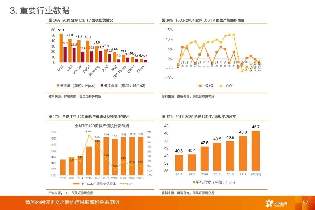 根据Omdia预测,2020年大尺寸FPD需求将达到2.2亿平方米,同比增长4%以上,而供给仅净增2%,供需偏紧。回顾2020,疫情限制设备、人员到位,制约LCD扩产速度;8寸圆晶满载,驱动芯片供给紧张,LCD扩产受限;10.5代线落地,TV面板平均尺寸加速增长,需求旺盛。20Q3,华星光电收购三星苏州产线、京东方收购中电熊猫,面板产能整合,两强格局开启,市场份额进一步向头部厂商聚集。展望2021,面板供需偏紧格局仍将持续。