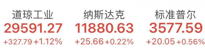 美国东部时间11月23日,阿斯利康宣布其与牛津大学合作研发的新冠病毒疫苗有效率最高可达90%,三大股指全线上涨。截至收盘,道琼斯工业平均指数涨1.12%,报29591.27点;纳斯达克综合指数涨0.22%,报11880.63点;标普500指数涨0.56%,报3577.59点。