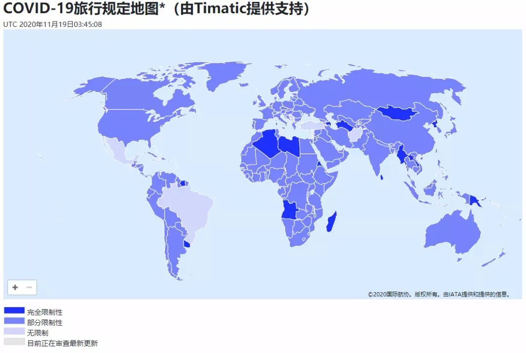 而在中国出入境严格管控的同时,国外也在对中国游客实施管控。上半年,全球范围内近百个国家和地区对中国旅客采取入境限制措施。从下图(来自于IATA Travel Center的COVID-19旅游型规定地图)即可看出。