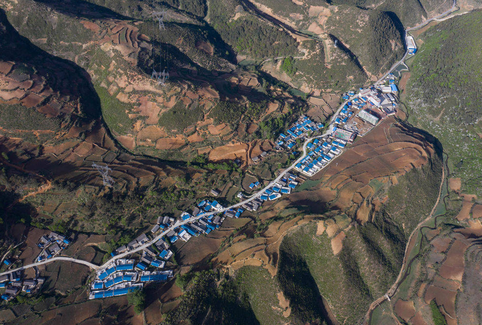俯瞰群山中的四川省布拖县乌科乡洛呷村集中安置点,来源:新华社