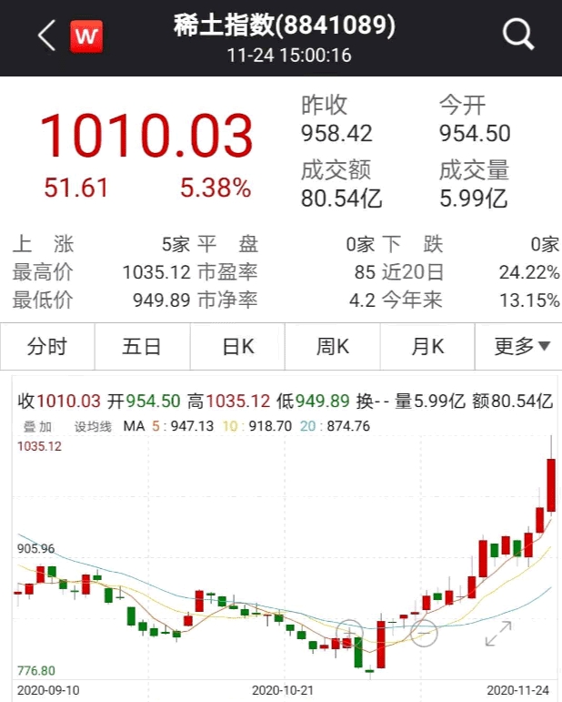 Wind稀土指数11月24日收涨5.38%,11月累计涨幅为28%。