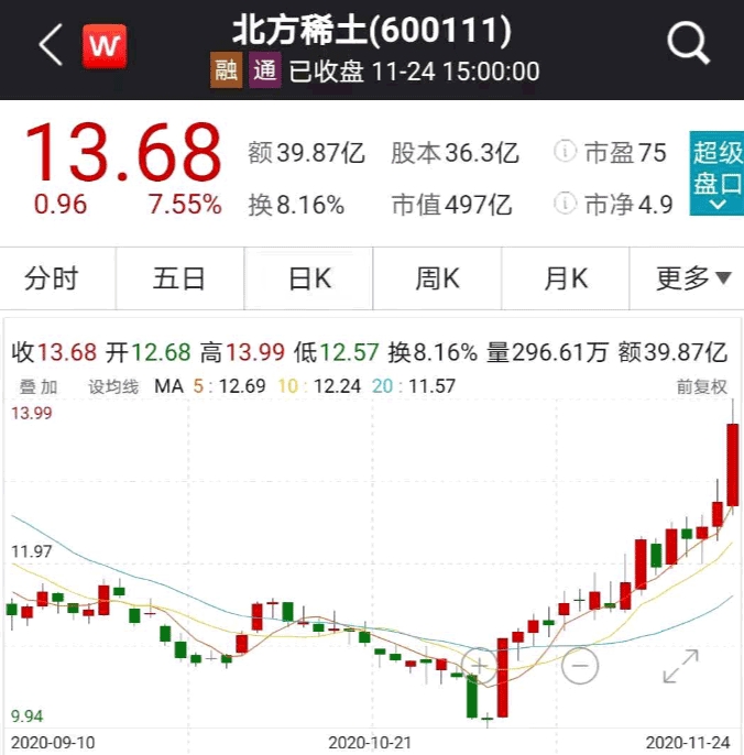 从个股来看,作为国内乃至全球的稀土龙头股,北方稀土11月已累计上涨36%。11月24日,北方稀土成为了主力资金最钟爱的个股,资金净流入量居榜首,为8.8亿元。