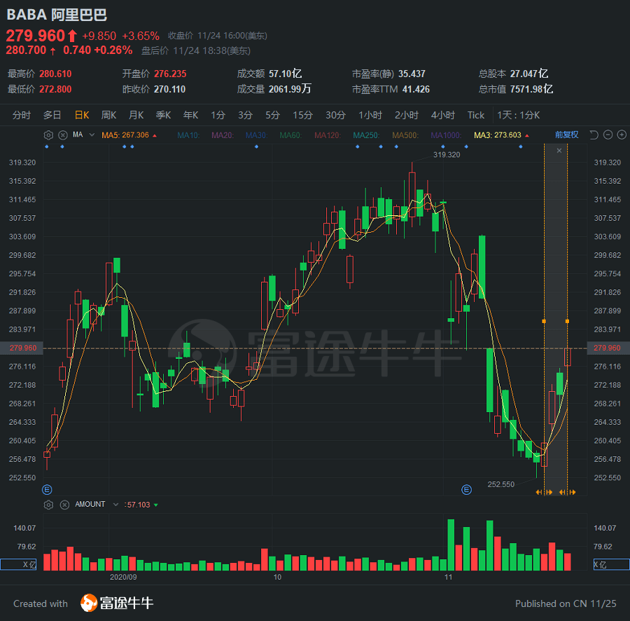受一系列事件影响,阿里巴巴股价从最高319美元跌至252美元,从历史高点回调约20%。近期,阿里巴巴股价走出颓势,近4个交易日累计涨幅达9.43%,市值站上7500亿美元。