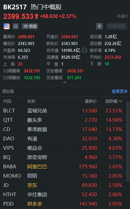 其他中概股方面,蓝城兄弟涨23%,趣头条涨14%,跟谁学上涨1.85%,唯品会上涨4.03%,网易有道上涨4.30%。