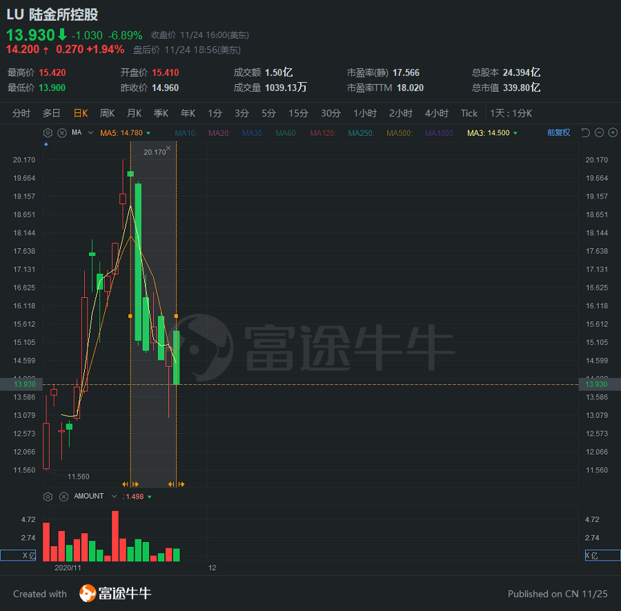 周二$陆金所控股(LU.US)$收跌6.89%,从11月16日高点20.17美元计算,回调幅度已达28%。