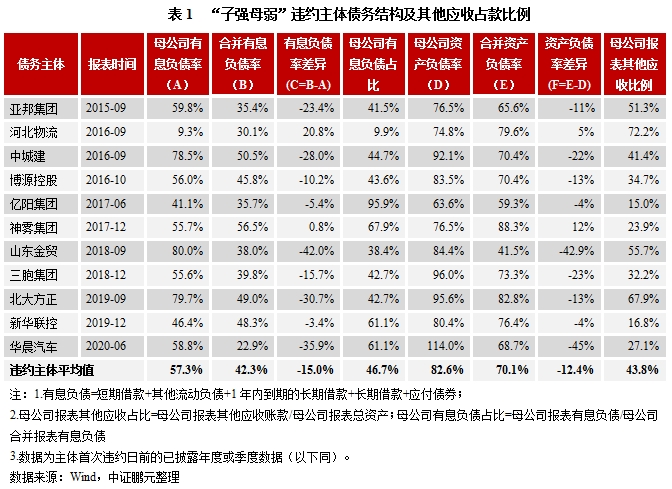 集团企业的经营管理模式决定了母公司作为独立主体在债务结构、流动性、盈利质量、控制力等多方面具有表现较差的特征。“子强母弱”集团母公司的偿债力依托于子公司,尤其是核心“造血”子公司。结合“子强母弱”集团企业在首次违约日前的集团和母公司财务表现,可以看出“子强母弱”型集团大多同时具有母公司负债率和子公司占款比例双高、母公司可用资金低、非核心业务盈利质量较差、少数股东权益占比大等多项特征,且特征突出。
