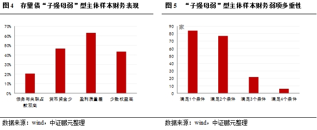 剔除已违约主体,共筛选出189家“子强母弱”型集团公司。其中,同时满足以上4项的主体数量共6家,4项中3项符合22家,符合2项77家,符合1项的84家。从主体级分布上,样本中“子强母弱”型主体的信用等级上以AAA级别为主,占比约51%,其中也有少量AA-级及以下主体,共3家。主体级别较低的三家在以上4项筛选条件中均存在2项以上;而符合较多(3项及以上)的主体中AA级以下占比显著提升。如前文所述,“子强母弱”型违约是多方面因素的综合作用的结果,“子强母弱”并不必然等同于母公司高风险,但同时满足三条以上的,信用表现相对较差。