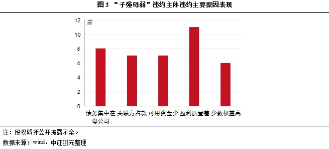 综上,“子强母弱”型违约主体的财务特征一般不会仅在某一方面表现较差,其最终违约是多方面综合作用的结果。归纳起来主要有5个方面:债务集中自母公司、子公司占款较重、盈利能力较弱、可用资金较少和少数股权较高。11家违约的“子强母弱”型主体的原因在均在盈利质量方面有所体现,其次是债务集中自母公司以及子公司占款较重。同时,11家中2家主体在以下5个主要原因方面中均有体现,5家在4个方面有所体现,2家3个方面有所体现。此外,“子强母弱”主体的投资人通常希望从核心子公司中获得偿债保障,但从实际来看,“子强母弱”型主体违约可能更多地是因为核心子公司的原因而走向违约,如核心上市子公司盈利恶化或者不能有效控制。