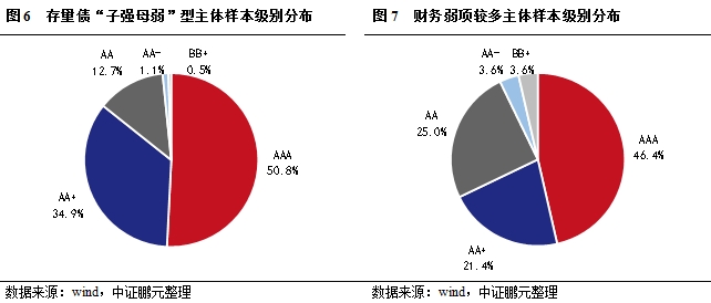 本文根据债务结构、流动性、盈利质量、控制力等方面从截至10月末存量债券产业债集团主体中进行筛选,共筛选出189家“子强母弱”型集团公司,51%的主体为AAA级别;其中28家在以上财务方面多项表现弱势。