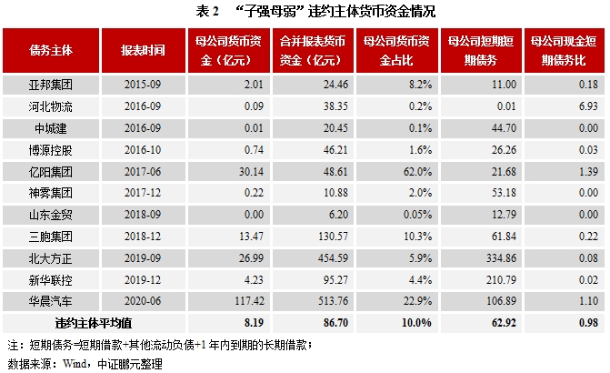 集团合并报表通常显示集团货币资金较为充足,但母公司账户的自有资金极少。在核心公司为上市公司的情形下,受监管约束,母公司与上市子公司之间的资金往来受到较多限制,上市子公司现金流并难以回流至集团。在核心子公司为非上市公司的情形下,母公司的内部资金协调能力则主要取决于母公司对子公司的实际控制能力。在“子强母弱”违约中,大多显示出集团整体资金可观,但母公司货币资金日常保有量过低,甚至不能满足日常运营的资金水平;显示母公司货币资金较多的主体,一方面其中包含了相当的受限制资金,另外相对其短期债务也覆盖略显不足。母公司账户资金极低从某种程度上反映出母公司正面临较大的流动性压力。