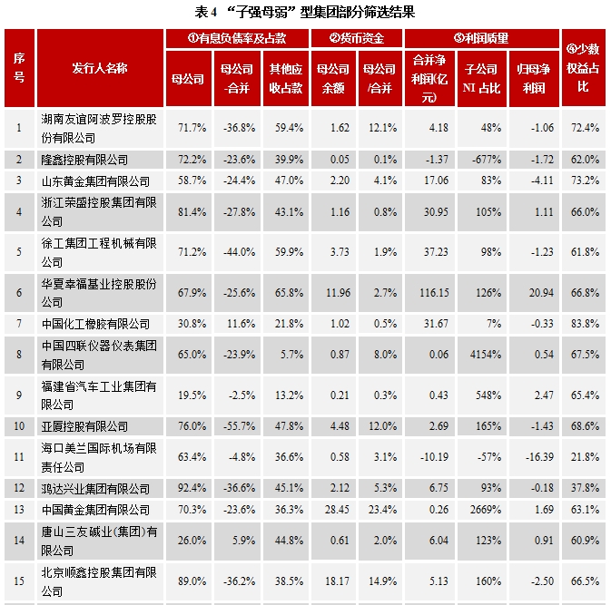 本文对截止2020年10月末有存续债券的产业债集团发行主体,根据母公司负债和占款水平、母公司现金水平、非上市部分盈利质量,以及少数股东权益等以下指标进行“子强母弱”筛选[2],为确保“子强”属性,发行主体需满足“母公司为非上市公司,上市子公司净利润合计超过2亿元”: