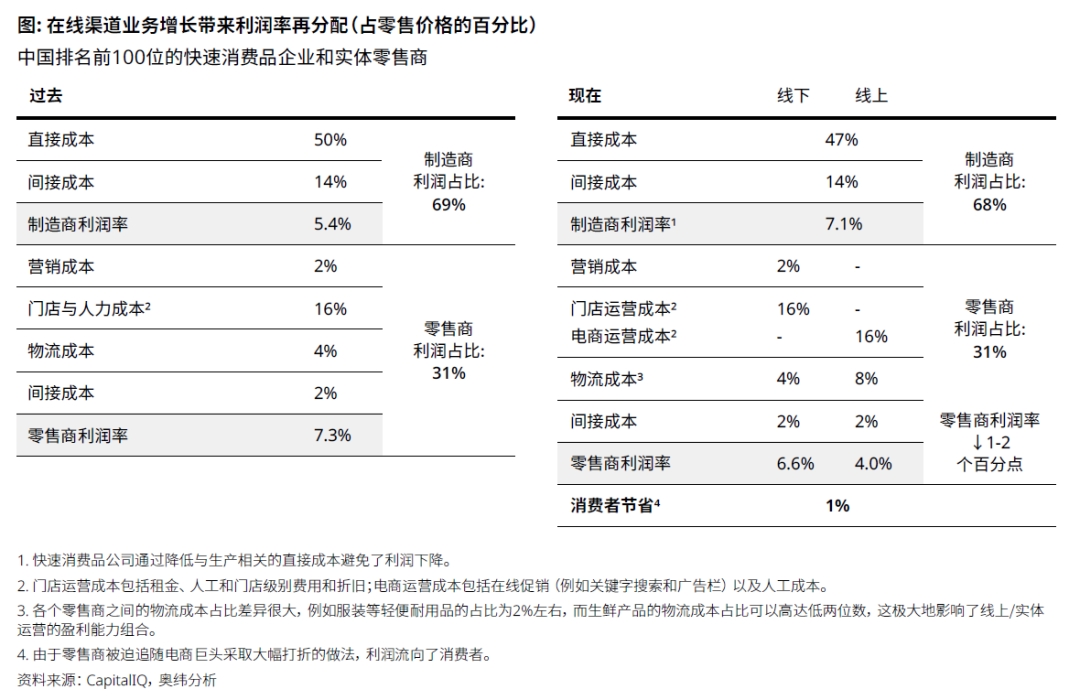 为了应对这种转向线上消费的趋势,零售及消费品企业纷纷开始投资从线上到线下的O2O模式,这导致了进一步的利润转移。尽管扩大线上平台规模可以降低线下的门店扩张和运营成本,但是物流和获取网络流量方面仍会产生不小的成本压力。不断增加的销售压力,再加上租金及人力成本,迫使零售商试图将负担转嫁给分销商和供应商(即消费品企业),后者为了维持自身的利润率份额,不得不挤压采购与制造方的利润率。